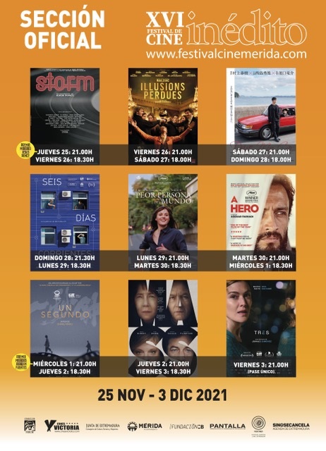 Las películas elegidas para la Sección Oficial de esta edición son ‘Storm’; ‘Las ilusiones perdidas’; ‘Drive my car’; ‘Seis días corrientes’; ‘La peor persona del mundo’; ‘Un héroe’ y ‘Mass’. El documental ‘Storm’, dirigida por Jesús Ponce, uno de los Premios Miradas de este año, será la encargada de abrir el certamen. Tras el pase, la propia formación sevillana que protagoniza este documental, ‘Storm’, ofrecerán un concierto en la ciudad emeritense.