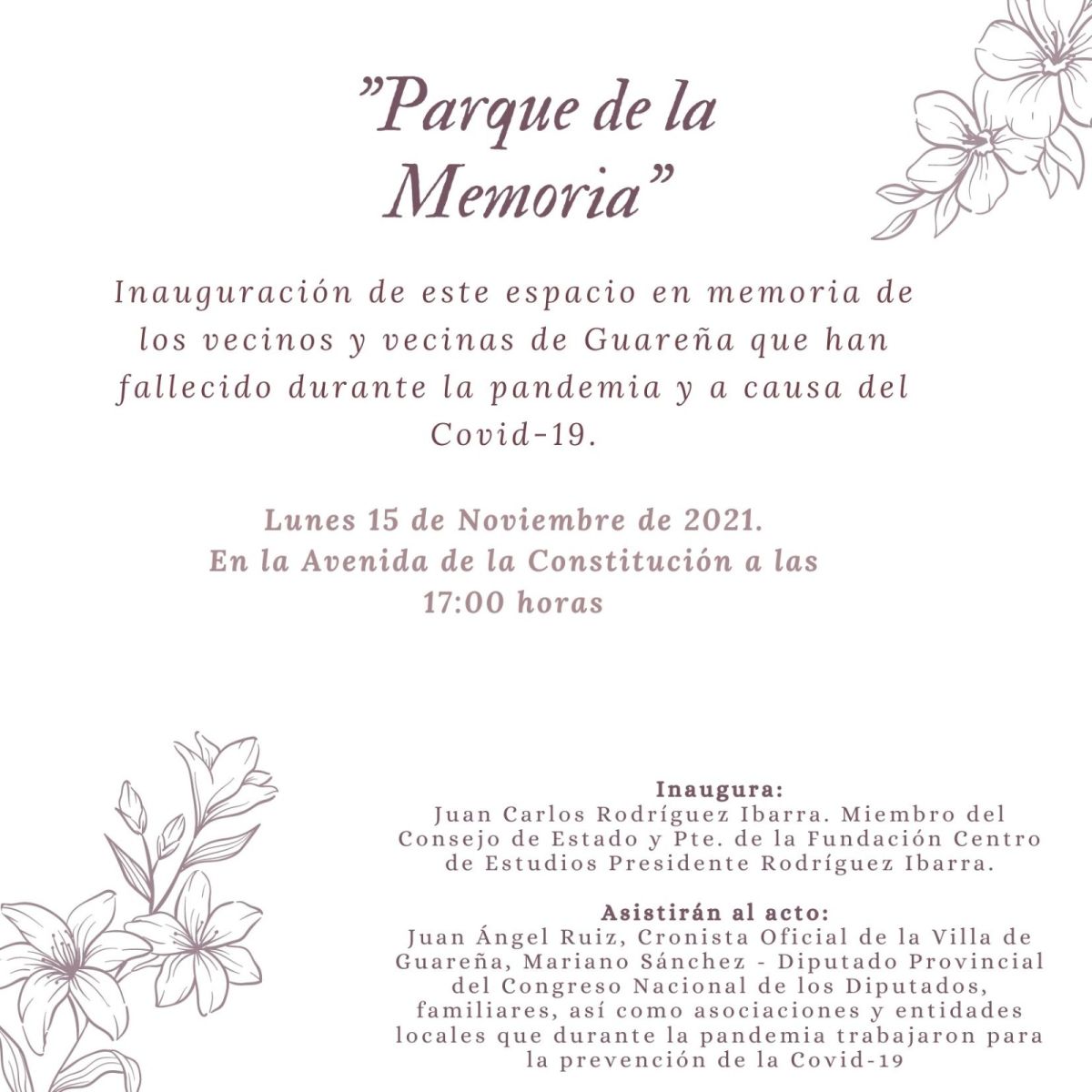 Asistirán a los actos, Juan Ángel Ruiz (Cronista Oficial de la Villa de Guareña) Mariano Sánchez, (Diputado Provincial del Congreso Nacional de los Diputados), familiares de las personas fallecidas, así como asociaciones y entidades locales que durante la pandemia trabajaron para la prevención del Covid-19
