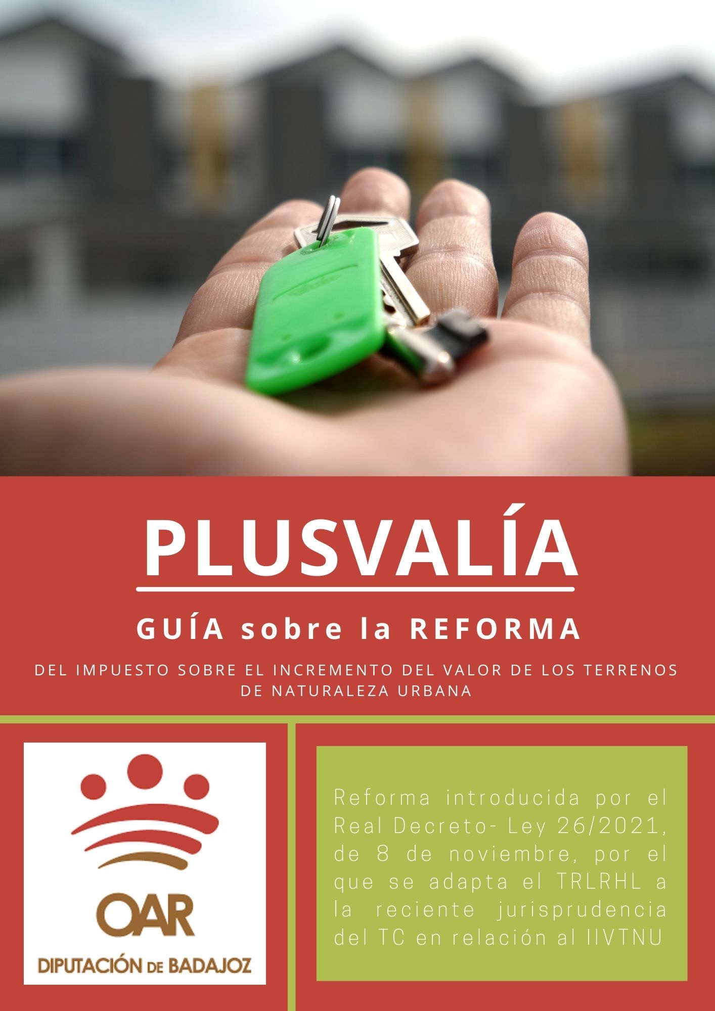 El Organismo Autónomo de Recaudación de la Diputación de Badajoz, ha editado una guía sobre la reforma de la Ley del Impuesto sobre el Incremento del Valor de los Terrenos de Naturaleza Urbana, conocido como Plusvalía, mediante el Real Decreto-Ley 26/2021, de 8 de noviembre, por el que se adapta el Texto Refundido de la Ley Reguladora de las Haciendas Locales, a la reciente jurisprudencia del Tribunal Constitucional, en relación con este impuesto. Esta guía puede descargarse desde la web del OAR