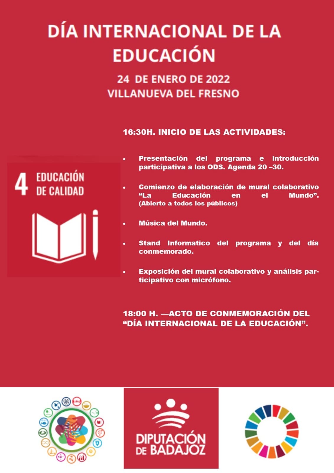 Para este Día de la Educación, la institución ha publicado un manifiesto en el que se recuerda que en octubre de 2019 aprobó su compromiso ineludible con la consecución de estos 17 ODS, compromiso al que se ha adherido el Ayuntamiento de Villanueva del Fresno. Al año siguiente salió adelante la I Estrategia de Desarrollo Sostenible, cuyo grado de ejecución ya llega al 45%. Con ello se pretende conseguir una provincia con las personas como prioridad, el cuidado del medio ambiente y su conciliación con un sistema económico sostenible que consiga mantener y atraer población al medio rural.