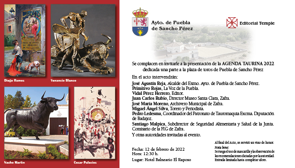 La prestigiosa publicación Agenda Taurina presenta su edición 2022 en un acto el próximo sábado 12 de Febrero en Balneario del Raposo, en Puebla de Sancho Pérez.