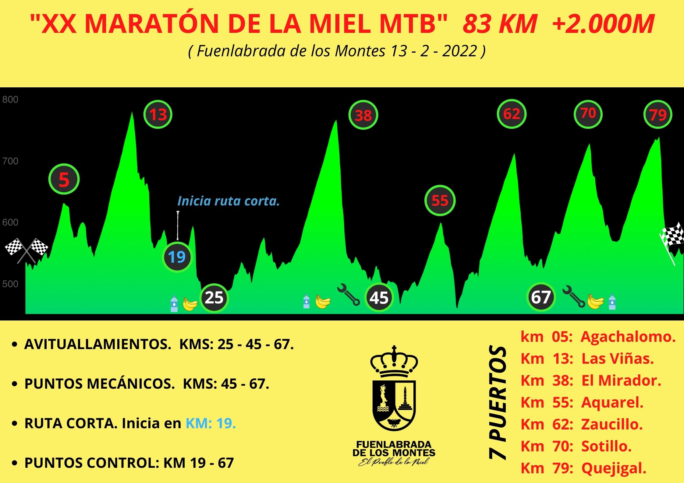 Agachalomo (km.5), Las Viñas (km.13), El Mirador (km.38), Aquarel (km.55), Zaucillo, (km.62), Sotillo (km.70) y Quejigal (km.79) son las siete cimas que deberán ascender durante los 83 kilómetros el recorrido los participantes de la Maratón de la Miel que el próximo domingo tomen la salida a las 9:30 horas de la mañana.