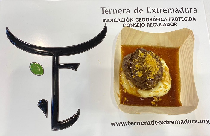 Estos platos son albóndiga de ternera con Indicación Geográfica Protegida, glaseada con salsa de vino con Denominación de Origen Ribera del Guadiana y patata cremosa; tartar de jamón ibérico con Denominación de Origen emulsión Dehesa de Extremadura y presa de cerdo ibérico con emulsión de Aceite con D.O.P Monterrubio; flor extremeña con queso DOP La Serena y miel de vino tinto DOP Ribera del Guadiana y tatín de cordero con Indicación Geográfica Protegida, CORDEREX.