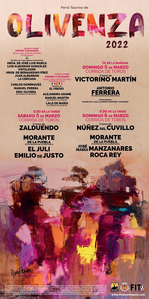 Regresa la Feria el Toro de Olivenza en su 31 edición tras el parón de los dos años anteriores por la pandemia. Para el diputado de Tauromaquia y vicepresidente 3º de la Diputación, Ramón Ropero, es todo un placer participar en la feria oliventina, “referente nacional importante y fecha obligada para que la Escuela Taurina de Badajoz esté presente”. En esta ocasión, la Diputación lleva stand propio con diverso material promocional, como el catálogo de la exposición de José M.ª Ballester sobre la historia de la escuela provincial. Además, estarán a disposición del público un manual sobre el significado de las corridas de toros y un cartel-folleto donde se recogen las plazas de toros fijas existentes en la provincia, así como un mapa con las ganaderías de reses bravas.