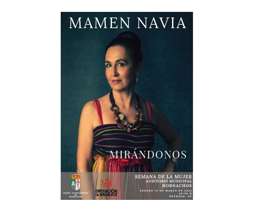 Con motivo de la Semana de la Mujer, el próximo 12 de marzo a las 20:30 horas el Auditorio Municipal de Hornachos acogerá la presentación del disco-libro ‘Mirándonos’ de Mamen Navia, concierto que forma parte de la programación de actividades que se llevarán a cabo con motivo del Día Internacional de la Mujer. La entrada serán 3 €. Organizan Excmo Ayuntamiento de Hornachos y Diputación de Badajoz.