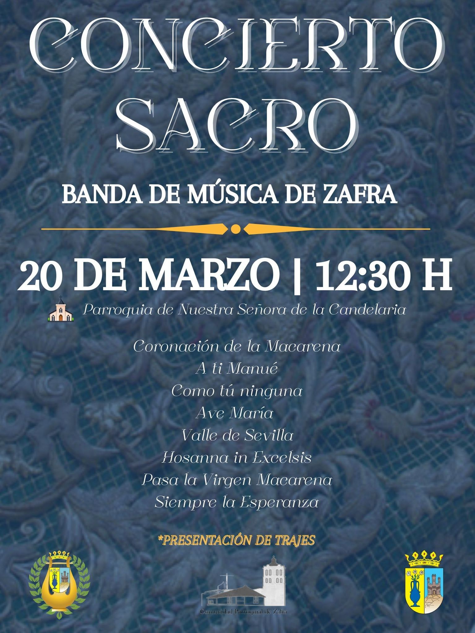 La Banda Municipal de Música de Zafra vuelve a actuar, dentro de las actividades previas a la Semana Santa, el domingo 20 de marzo a las 12.30 horas en la Parroquia de Santa María de la Candelaria que ofrecerá un concierto de música sacra y todos los componentes estrenarán sus nuevos trajes oficiales.
