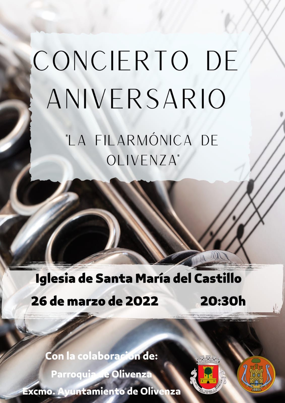 La Excelentísima Filarmónica de Olivenza celebra sus 171 aniversario con un concierto el próximo 26 de marzo a las 20:30 horas en la Iglesia de Santa María del Castillo de Olivenza. La sociedad cultural actuará bajo la batuta de Salvador Rojo Gamón y el programa del concierto se facilitará ese día al público asistente. La entrada será gratuita hasta completar aforo.