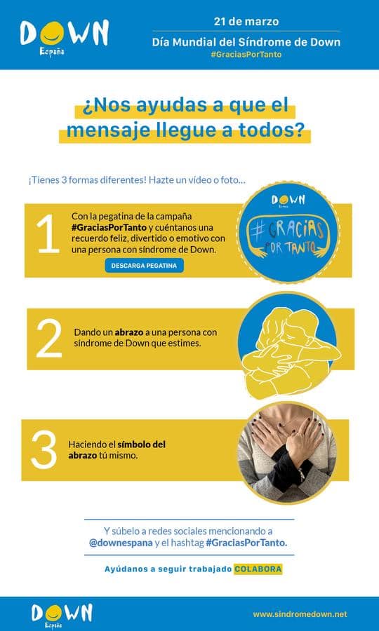 La Asociación Síndrome de Down de Zafra está desarrollando una serie de actividades que vienen a sumarse a las iniciativas puestas en marcha a nivel nacional desde Down España para conmemorar el 21 de marzo. Este año, bajo el lema #Gracias por tanto, se quiere agradecer a los cientos de miles de ciudadanos que, de forma desinteresada, apoyan cada día a las personas con trisomía 21, hacen su vida más bonita y mejoran su inclusión en la sociedad. La campaña se puede seguir a través de las redes sociales (Facebook e Instagram), donde se van subiendo vídeos y fotografías.