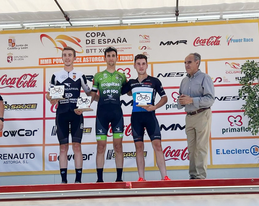 Foto cuerpo de texto: Podio Power Race Astorga Sub23 con Miguel Benavides del Extremadura-Ecopilas como vencedor de la prueba