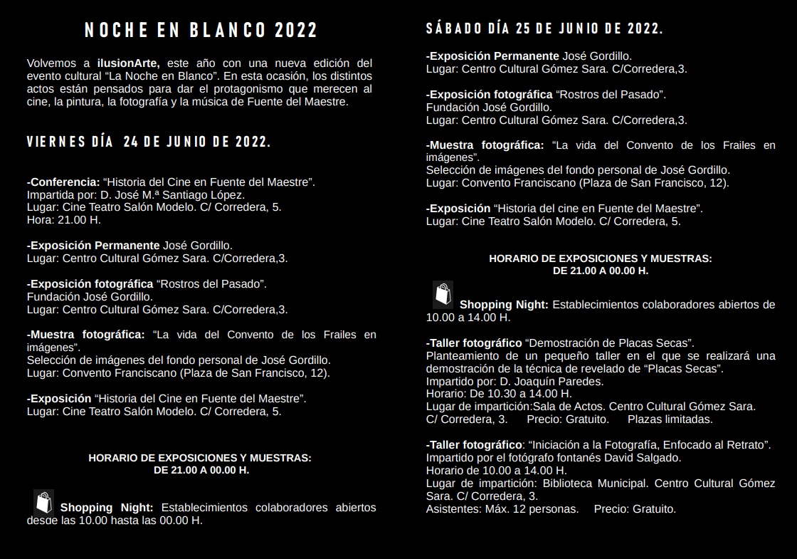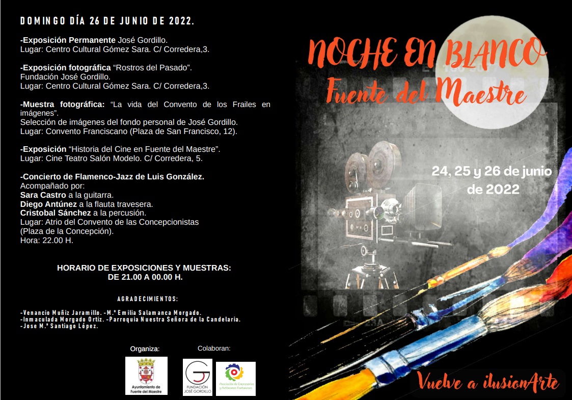 La Noche en Blanco está organizada por la Concejalía de Turismo del Ayuntamiento de Fuente del Maestre, desde donde han querido agradecer la colaboración de la “Fundación José Gordillo, del Centro Cultural Gómez Sara, de la Oficina de Turismo, de la Asociación de Empresarios y Autónomos Fontaneses, de Venancio Muñiz Jaramillo, de M.ª Emilia Salamanca Morgado, de Inmaculada Morgado Ortiz, de José María Santiago López, y de la Parroquia Nuestra Señora de la Candelaria, para que todos los fontaneses podamos disfrutar de esta actividad tan interesante”.