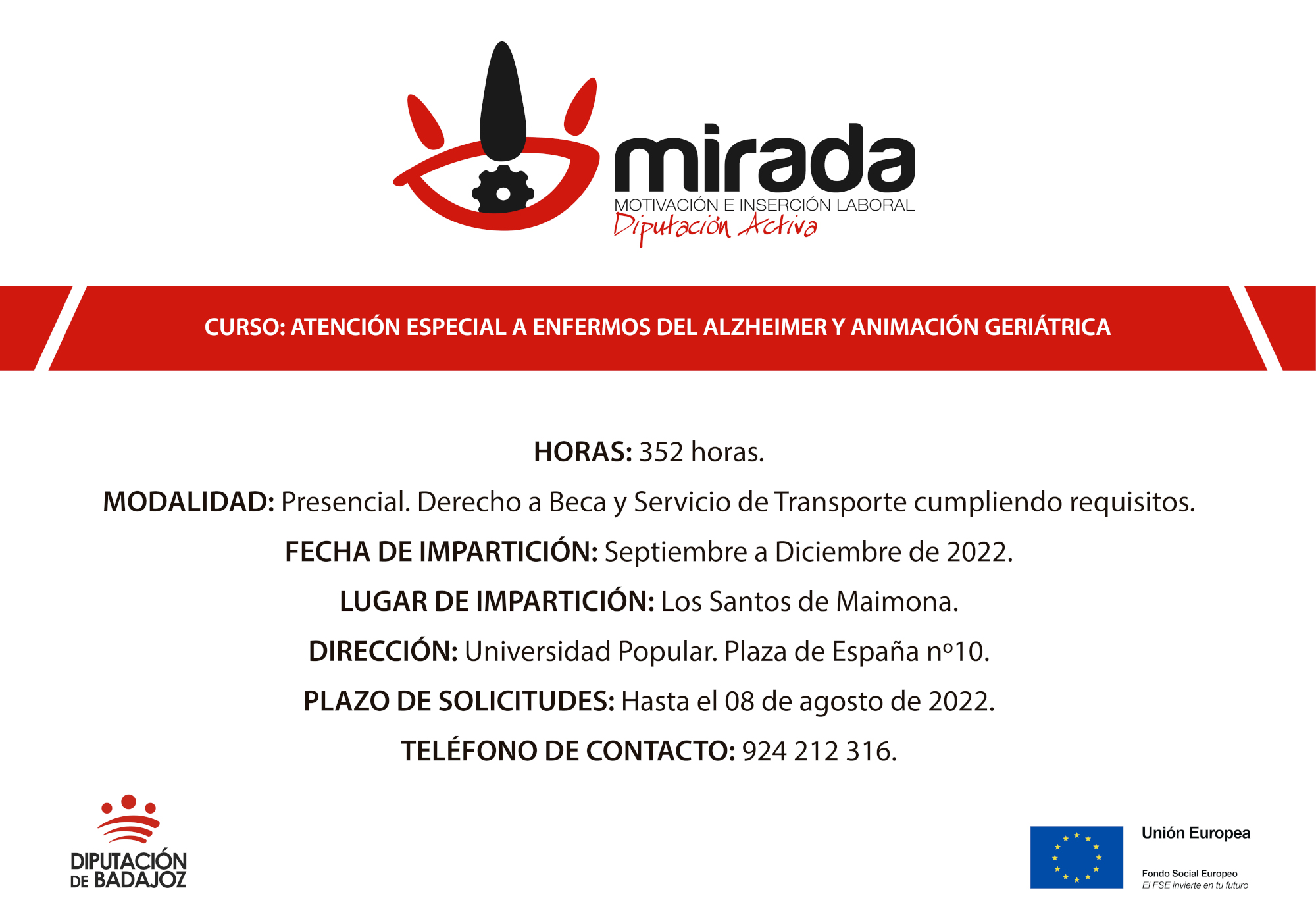 La Diputación de Badajoz, a través del Proyecto MIRADA (Motivación e Inserción Laboral Diputación Activa), desarrollado por el Servicio de Capacitación para el Empleo, dependiente del Área de Desarrollo Rural y Sostenibilidad de la Diputación de Badajoz, va a iniciar una acción formativa en ‘’Atención especial a enfermos de Alzheimer y animación geriátrica’’ en la localidad de Los Santos de Maimona.