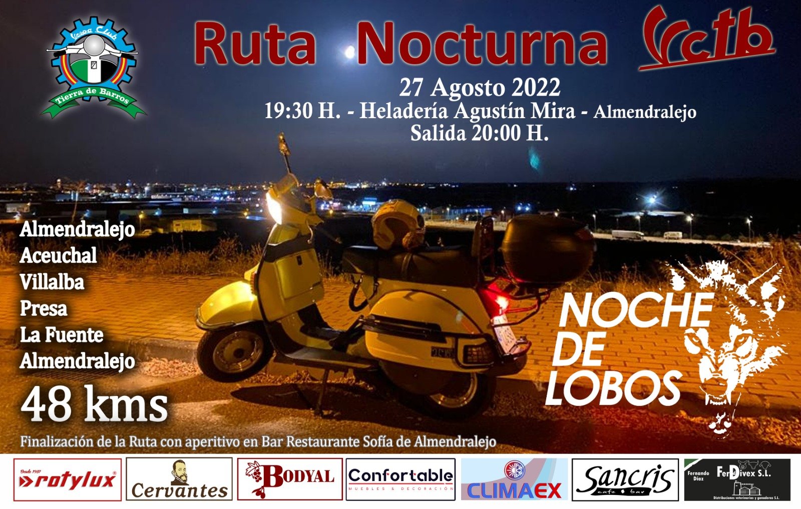 El Vespa Club Tierra de Barros, con sede en Almendralejo, ha organizado una nueva ruta en vespa por la comarca, que tendrá lugar este sábado 27 de Agosto, bajo el nombre de “Noche de Lobos”.