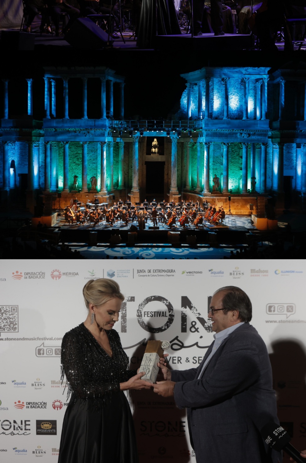 Minutos antes de iniciar su actuación Elīna Garanča recibió la estatuilla STONE M, que cada año entrega el STONE & MUSIC Festival a los artistas que pasan por el certamen. Y la recibió de la mano de Fernando Núñez, responsable de la Fundación Fernando Núñez. Elīna Garanča se mostró “muy feliz” por actuar en un escenario tan especial como el del Teatro Romano de Mérida.