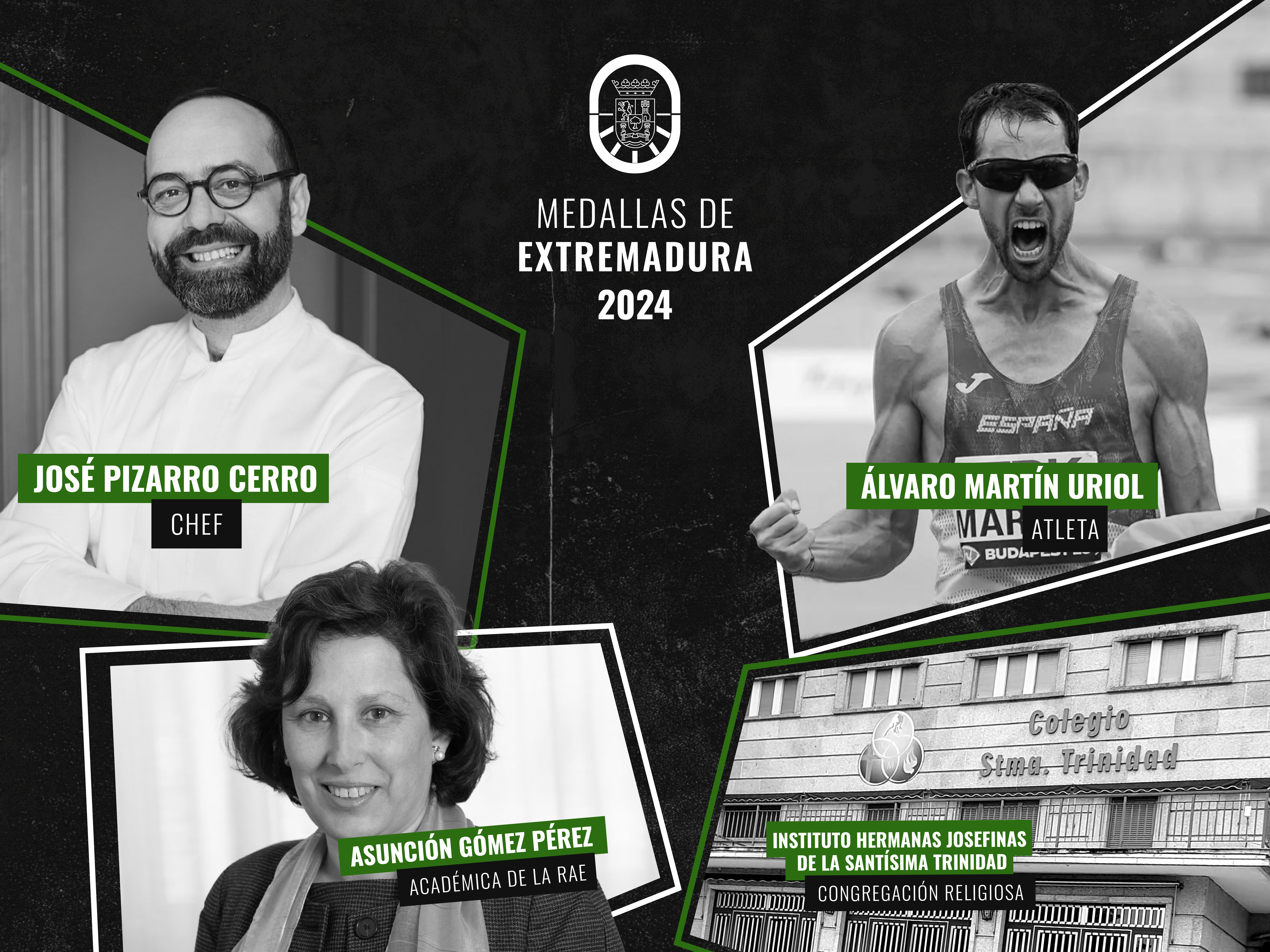 El chef José Pizarro, natural de Talaván; el atleta llerenense Álvaro Martín Oriol; la ingeniera informática Asunción Gómez Pérez, de Azuaga, y el Instituto Hermanas Josefinas de la Santísima Trinidad, congregación religiosa de Plasencia, recibirán el próximo día 7 de septiembre, en el acto institucional que se celebrará en Mérida, la Medalla de Extremadura 2024, como reconocimiento a su trayectoria.