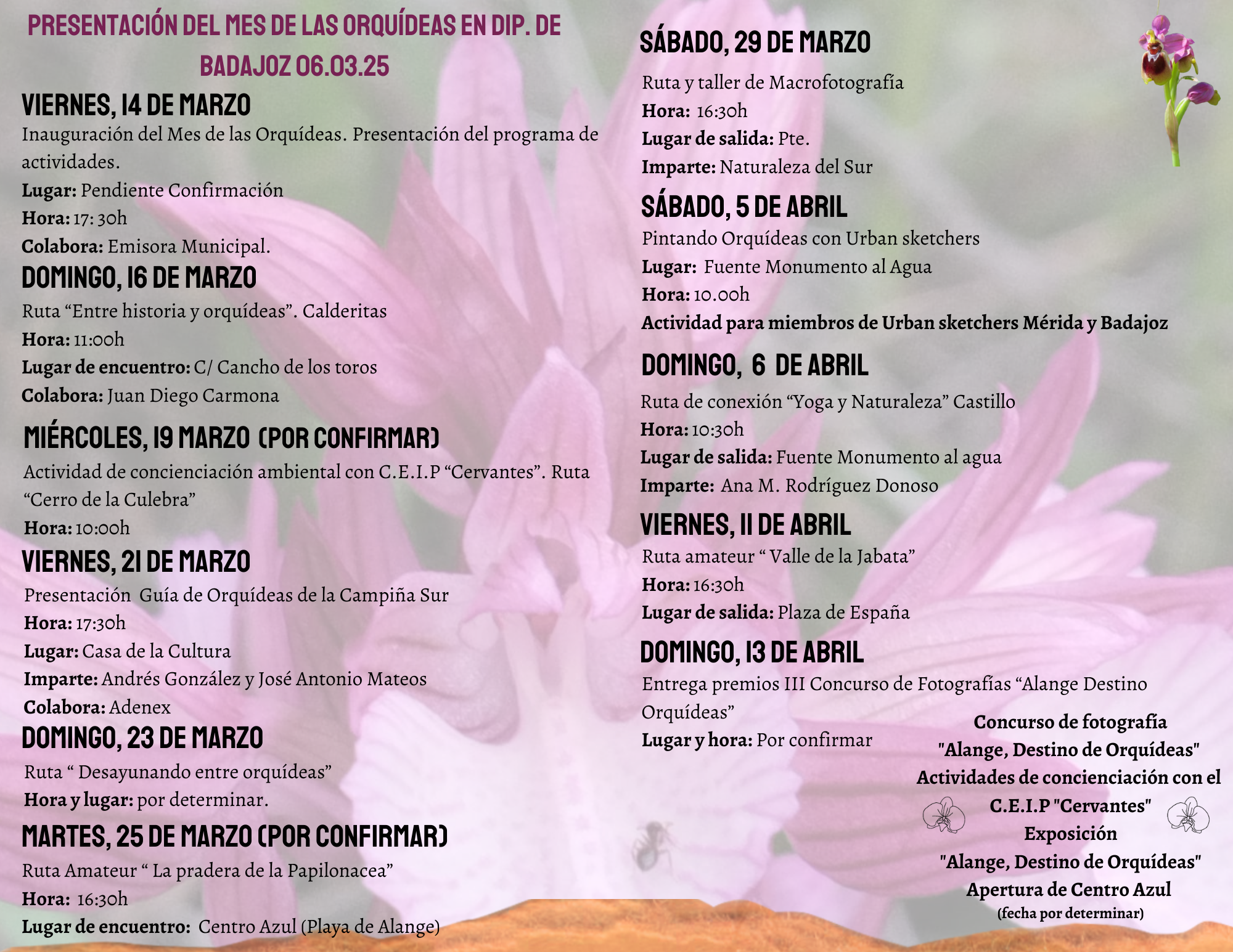Por su parte, Ana López, técnico de la Oficina de Turismo, desgranó la programación de esta cuarta edición de la festividad, donde destacan las rutas “cortas y sencillas”, y en las que se pueden ver muchas especies de orquídeas en un corto recorrido. En una de ellas, que tendrá lugar el 16 de marzo, se podrán observar también pinturas rupestres, mientras que la del 6 de abril introducirá a los participantes en el yoga. Además, se realizarán actividades con los alumnos del colegio de la localidad, y se ha convocado el concurso fotográfico ´Alange, Destino de Orquídeas´, que cumple este año su tercera edición.