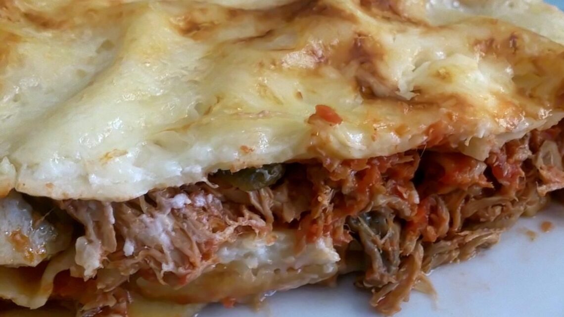 Repetimos dos veces hasta formar tres capas de pasta y carne. Por último, tapamos la lasaña con una capa más de pasta y ponemos encima la bechamel.