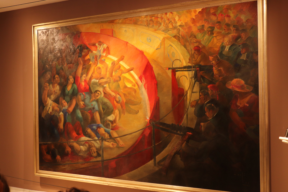 ‘Fusilamientos en la Plaza de Toros de Badajoz’ es una obra, ha afirmado, “que constituye todo un testimonio histórico y se erige como un emotivo reconocimiento hacia quienes fueron víctimas de la violencia desatada durante la Guerra Civil Española, aquí, en nuestra propia ciudad”. En efecto, los ecos en prensa sobre la masacre en Badajoz y el compromiso político del pintor catalán inspiran el gran lienzo de 1937. Un gran formato que hace que el espectador se sienta incluido en la terrible escena en la que se contempla a la gran masa de población en el albero de la plaza dirigiendo sus miradas, sin rendirse, hacia el pelotón de fusilamiento que, desde la barrera, acabará con la vida de hombres, mujeres y niños.