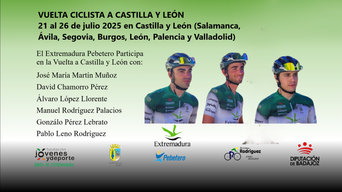 El Extremadura Pebetero, equipo patrocinado por la Fundación Jóvenes y Deporte, Pebetero, Diputación de Badajoz, Ayuntamiento de Zafra y Bicicletas Rodríguez competirá en la II Vuelta a Castilla y León que se celebra los próximos días del 21 al 26 de este mes de julio, siendo la vuelta mas larga del calendario español. El equipo competirá por alcanzar alguna victoria de etapa é incluso se piensa en poder pelear por estar en el podium, todo ello ante una participación muy selecta y exigente de 20 equipos de 6 corredores que pondrá en línea de salida de la primera etapa a un pelotón de 120 corredores.