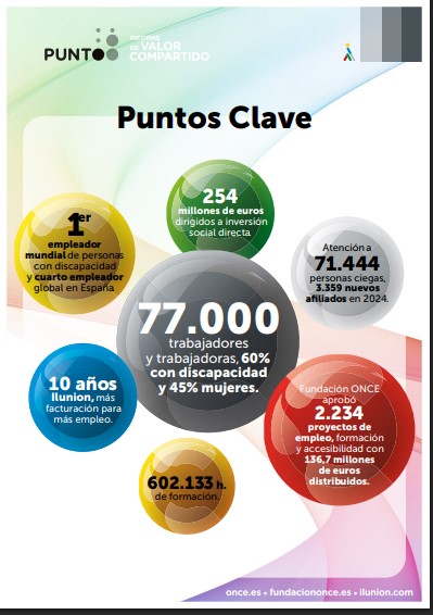 Los datos globales muestran una acción global, amplia y solidaria en todos los aspectos, para impulsar una sociedad más inclusiva y mejor para toda la ciudadanía: representamos 1 de cada 285 empleos que hay en España; hemos impulsado en 2024 un total de 602.133 horas de formación para que nuestros profesionales con y sin discapacidad sean los mejores en todos los ámbitos; y, cuando se cumplen 200 años del Braille, estamos impulsando en todo el mundo su declaración como Bien Cultural Inmaterial de la Humanidad, dado que estos seis puntos en relieve que conforman el braille como método de lectoescritura abrieron el mundo a más de 300 millones de personas ciegas.