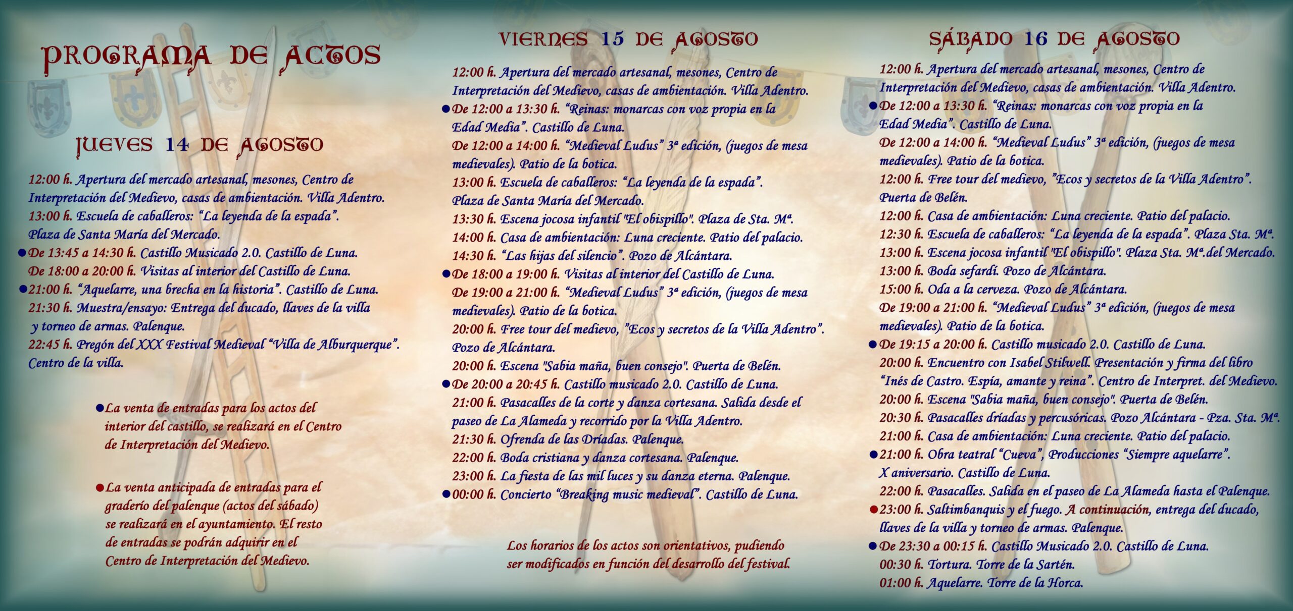 Nuevamente, será la figura de D. Beltrán de la Cueva, primer Duque de Alburquerque, quien actúe como el HILO CONDUCTOR entre todos los actos que componen el Programa que este año se llevará a cabo durante los días 14, 15 Y 16 de AGOSTO, en los que la ambientación y el teatro de calle, la música, las bodas cristiana y judía, la exhibición de armas y torneo medieval, las danzas nobles, moras y aldeanas evocan la convivencia pacífica que se vivía en aquella época entre las tres culturas. También el lado más oscuro y lóbrego de esta época viene representado por actos como la tortura o el Aquelarre. Todo ello perfectamente enzarzado en un completo Programa extenso y completo que se presenta en esta sesión.