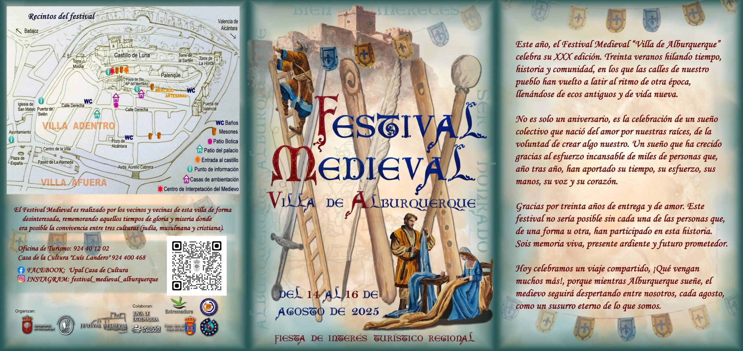 Esta nueva edición supone un hito importante, pues celebran la XXX edición del Festival Medieval Villa de Alburquerque. Cabe resaltar, y este año con mayor motivo, que todas estas ediciones no hubiesen sido posible sin la implicación desinteresada de cada uno de los vecinos y vecinas de la localidad. Hay que hacer extenso el agradecimiento a todos y todas las visitantes, ya sean de otras localidades cercanas, como a aquellas familias y personas que un día tuvieron que abandonar su pueblo y, que como alburquerqueños y alburquerqueñas regresan cada año para disfrutar de la celebración de la fiesta, y participan igualmente en cada uno de los actos que se desarrollan.