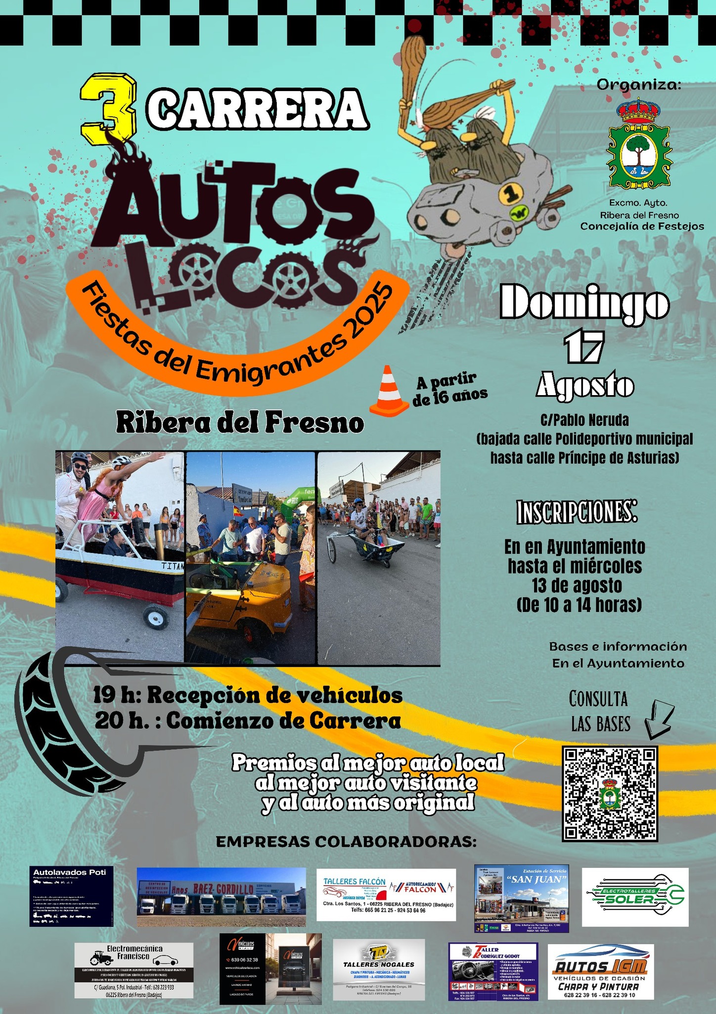 La imaginación, la destreza artesanal y el humor regresan a las calles de Ribera del Fresno con la celebración de la III Carrera de Autos Locos, una de las actividades más esperadas dentro del programa de las Fiestas del Emigrante 2025. La cita tendrá lugar el domingo 17 de agosto a las 20:00 horas en la calle Pablo Neruda, en la tradicional bajada del Polideportivo Municipal hasta la calle Príncipe de Asturias.