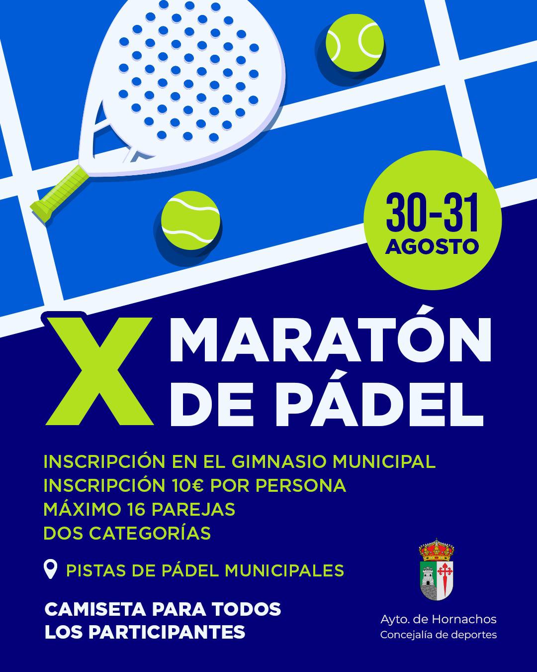 Hornachos volverá a vibrar al ritmo de las palas con la celebración de su décima edición del Maratón de Pádel, que tendrá lugar los días 30 y 31 de agosto en las pistas municipales. Las inscripciones están abiertas en el Gimnasio Municipal con un coste de 10 € por persona, admitiéndose un máximo de 16 parejas, distribuidas en dos categorías.