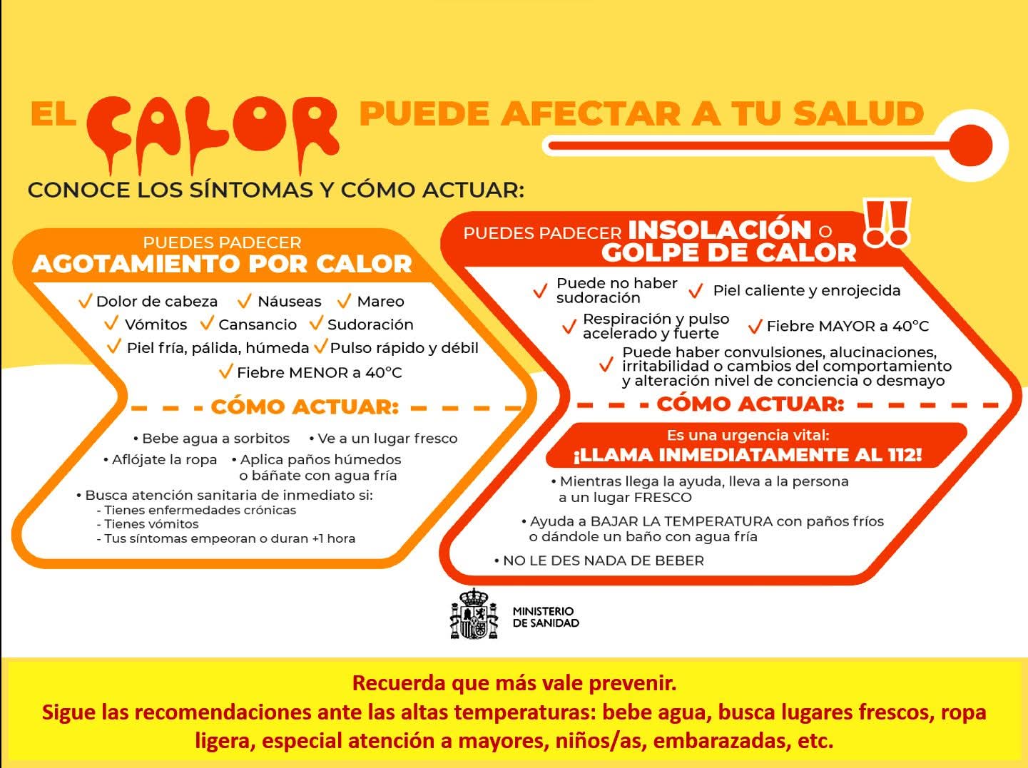 A la ciudadanía se le aconseja evitar la exposición al sol en las horas centrales del día; beber abundantes líquidos sin esperar a tener sed, sobre todo agua y zumos de fruta refrigerados; evitar comidas copiosas y no abusar de bebidas alcohólicas; reducir la actividad física y permanecer en lugares ventilados o acondicionados.