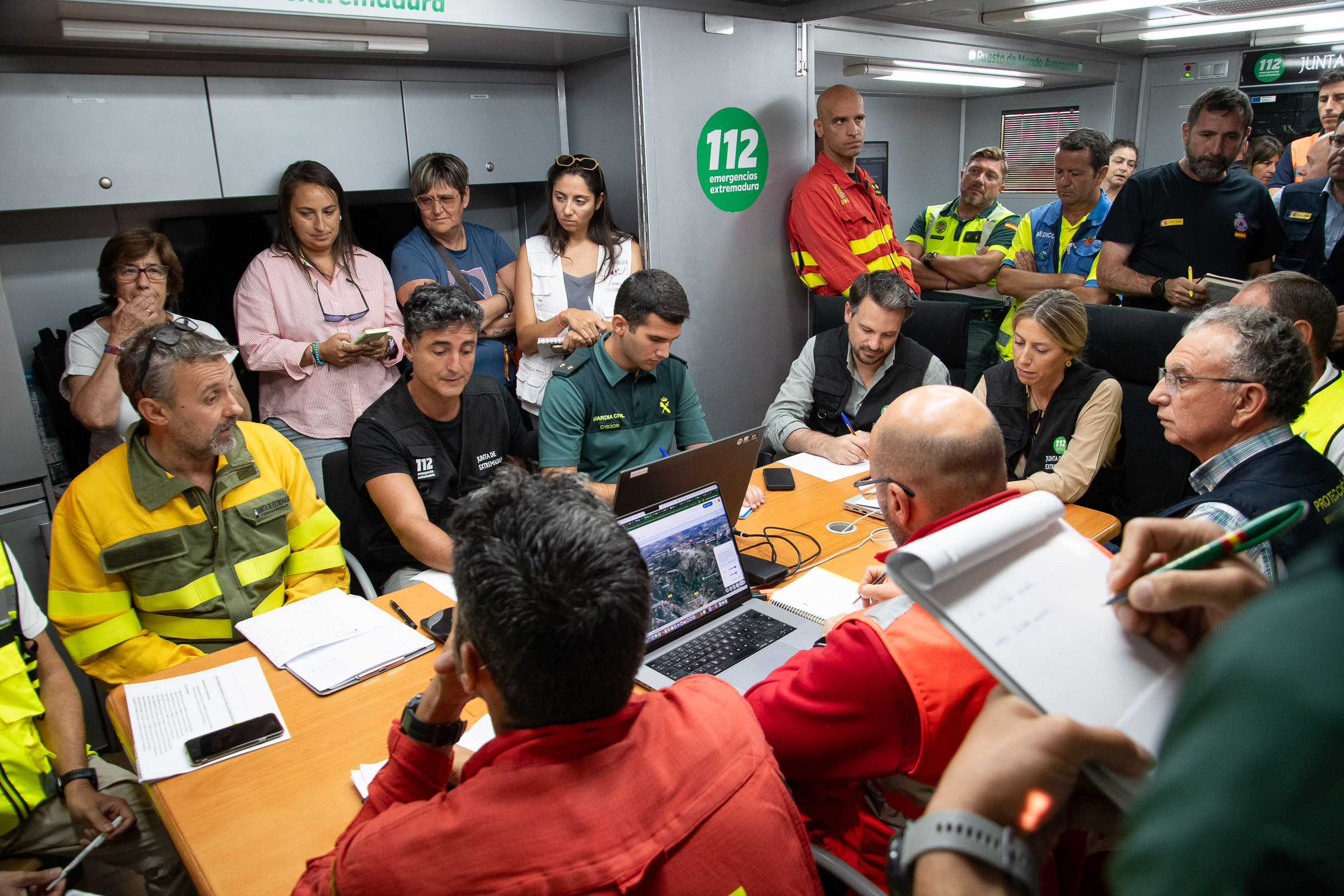 La presidenta de la Junta de Extremadura, María Guardiola, ha presidido este jueves una nueva reunión del CECOPI, en la que también han participado el consejero de Presidencia, Interior y Diálogo Social, Abel Bautista, y el consejero de Gestión Forestal y Mundo Rural, Francisco Ramírez.
