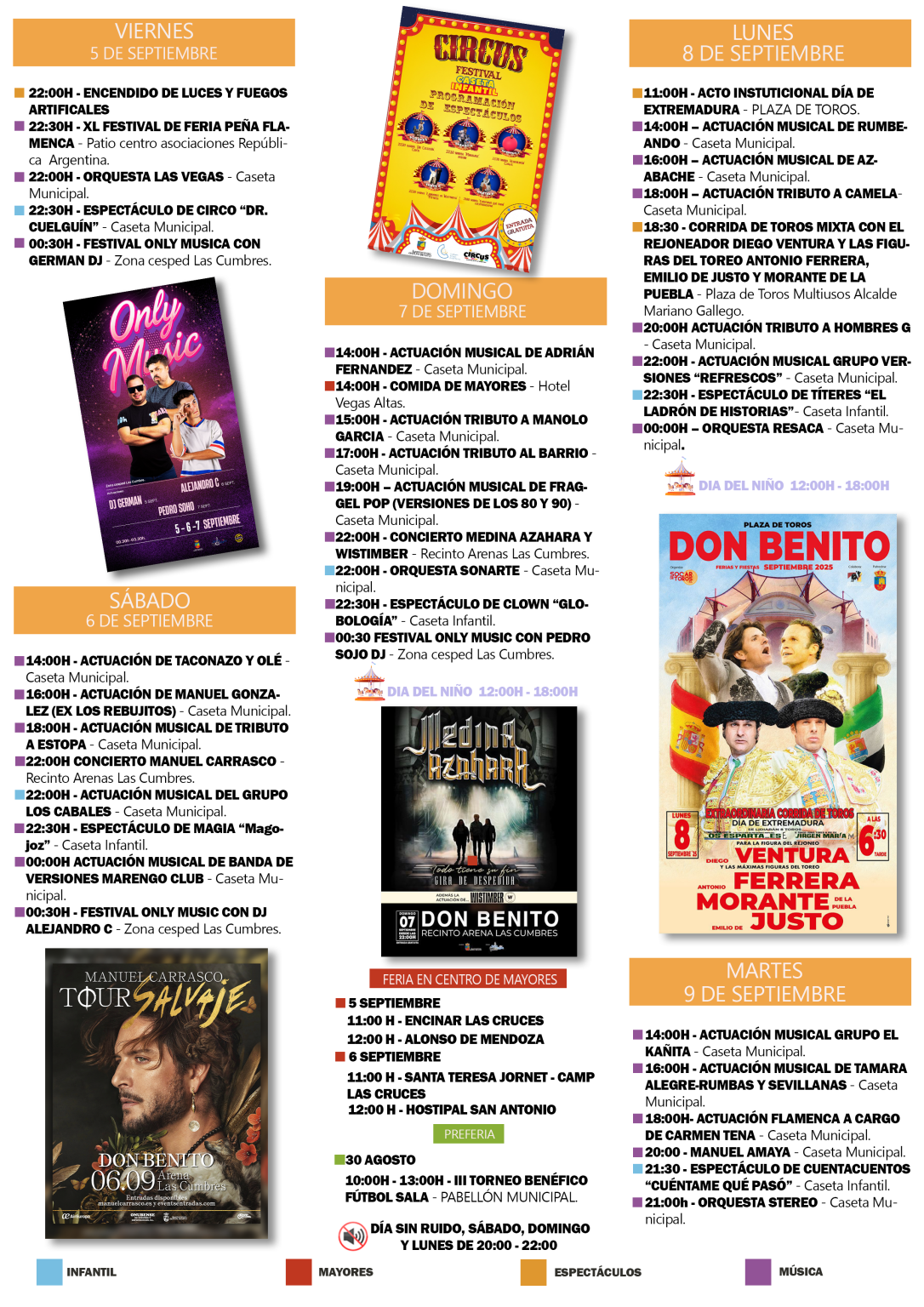 El programa de fiestas coincide como cada año con las celebraciones del Día de Extremadura el día 8. Con esta ocasión se ha convocado un acto institucional a las 11.00 en la Plaza de Toros Mariano Gallego y a las 18.30 se celebrará, en el mismo lugar, una corrida de toros mixta con el rejoneador Diego Ventura y las figuras del toreo Antonio Ferrera, Emilio de Justo y Morante de la Puebla.