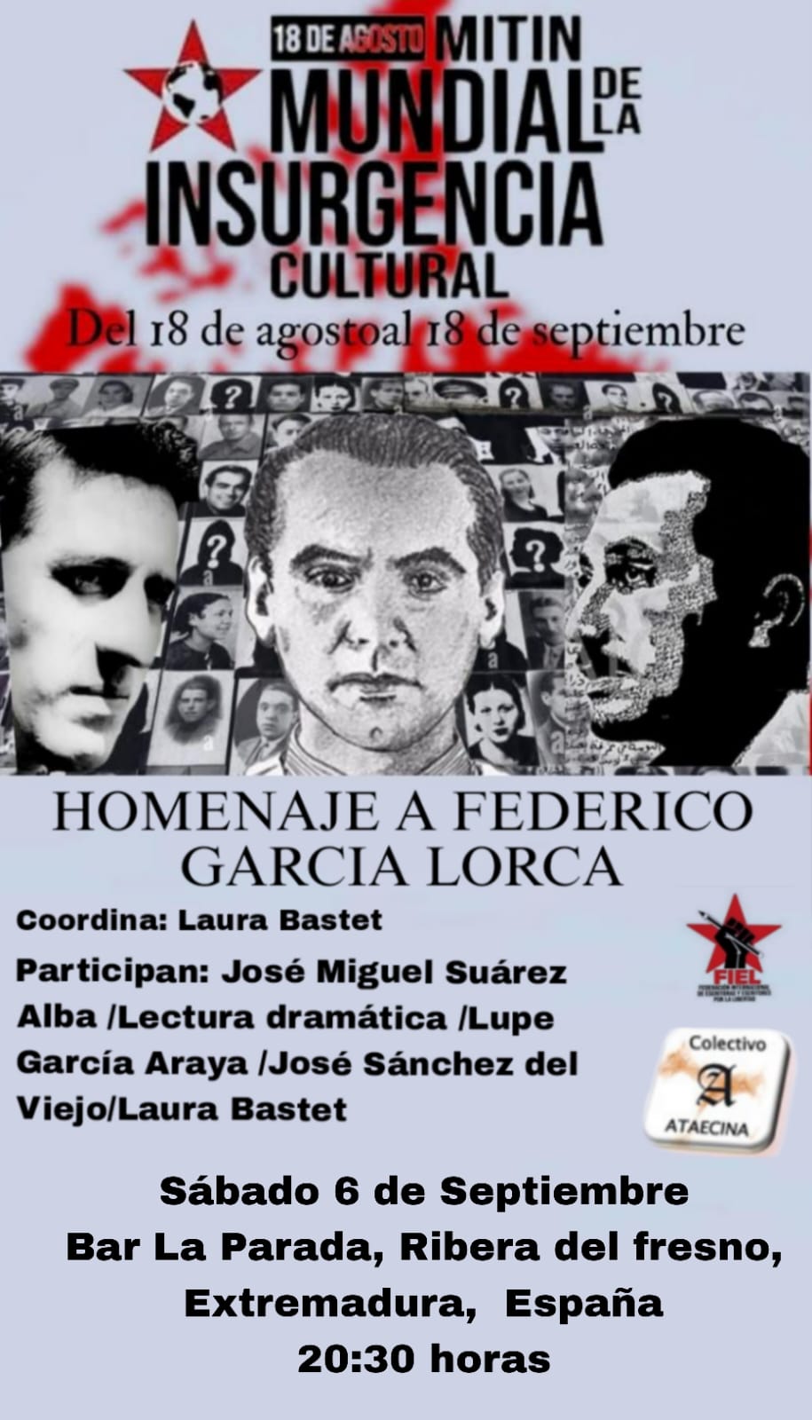 El próximo sábado 6 de septiembre, a las 20:30 horas en el Bar La Parada, se celebrará un acto de homenaje a Federico García Lorca en el marco del Mitin Mundial de la Insurgencia Cultural, que se desarrolla entre el 18 de agosto y el 18 de septiembre en más de 40 países y con la participación de un centenar de poetas y artistas.