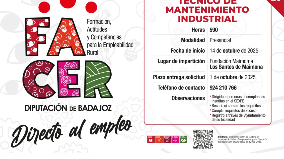 El Proyecto FACER, impulsado por la Diputación de Badajoz a través del Área de Formación y Capacitación para el Empleo, ha iniciado el pasado 1 de septiembre la difusión de una nueva acción formativa bajo la denominación “Técnico de Mantenimiento Industrial”, que se desarrollará en la localidad de Los Santos de Maimona y cuyo inicio está previsto para el próximo 14 de octubre.