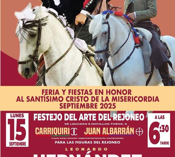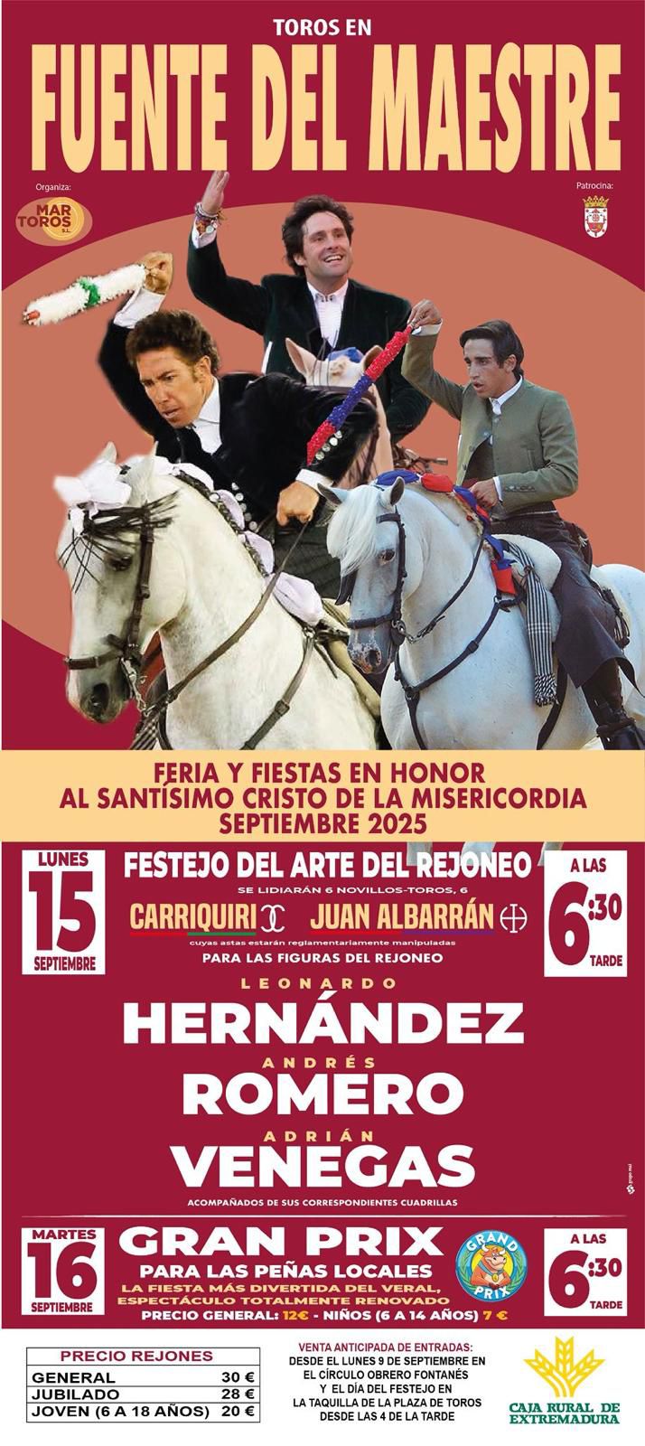 Con motivo de las Fiestas Patronales en Honor al Santísimo Cristo de las Misericordias, en la Plaza de Toros de Fuente del Maestre se celebrará, este lunes 15 de septiembre, a partir de las 18:30 horas, un Gran Festejo del Arte del Rejoneo.