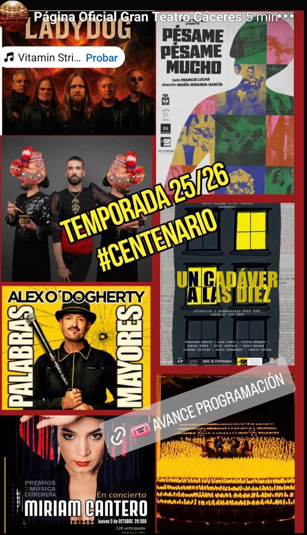 El Gran Teatro de Cáceres presentó el viernes 12 de septiembre la programación de su próxima temporada, que reunirá propuestas teatrales, musicales y culturales de primer nivel. Entre ellas destaca la participación de la compañía Batilo Teatro, dirigida por la ribereña María Miranda García, que llevará a escena la comedia Pésame, Pésame mucho el domingo 21 de septiembre a las 20:30 horas en la sala principal del teatro, dentro del ciclo organizado por la Federación de Asociaciones de Teatro de Extremadura (FATEX).