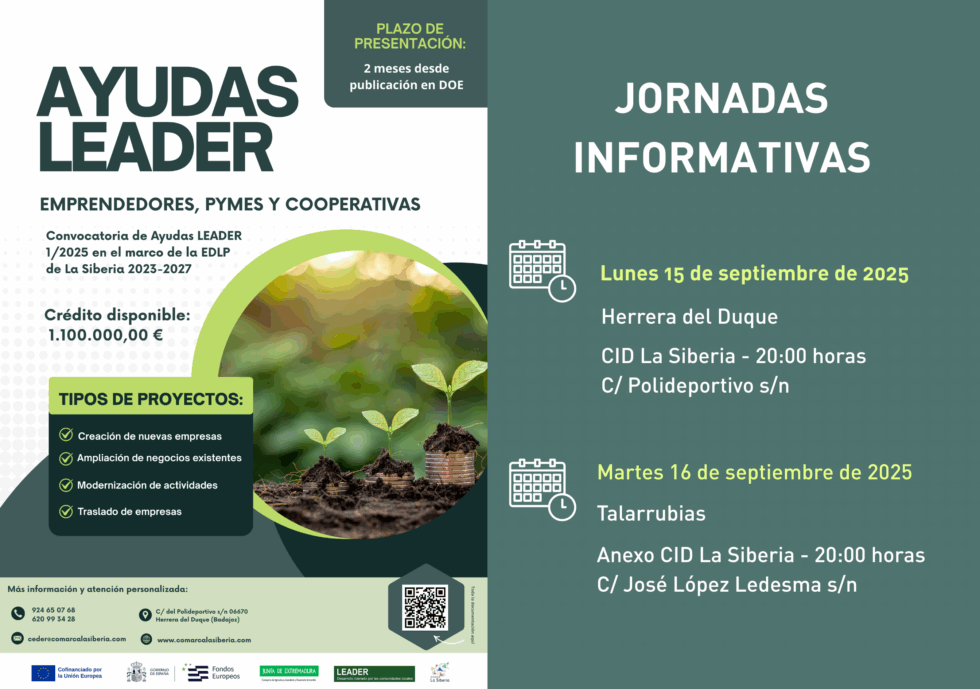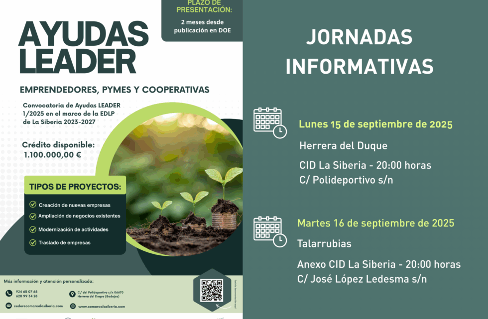 Si estás interesado en recibir información sobre estas ayudas que gestionan desde el CEDER La Siberia, puedes asistir a cualquiera de las dos reuniones: