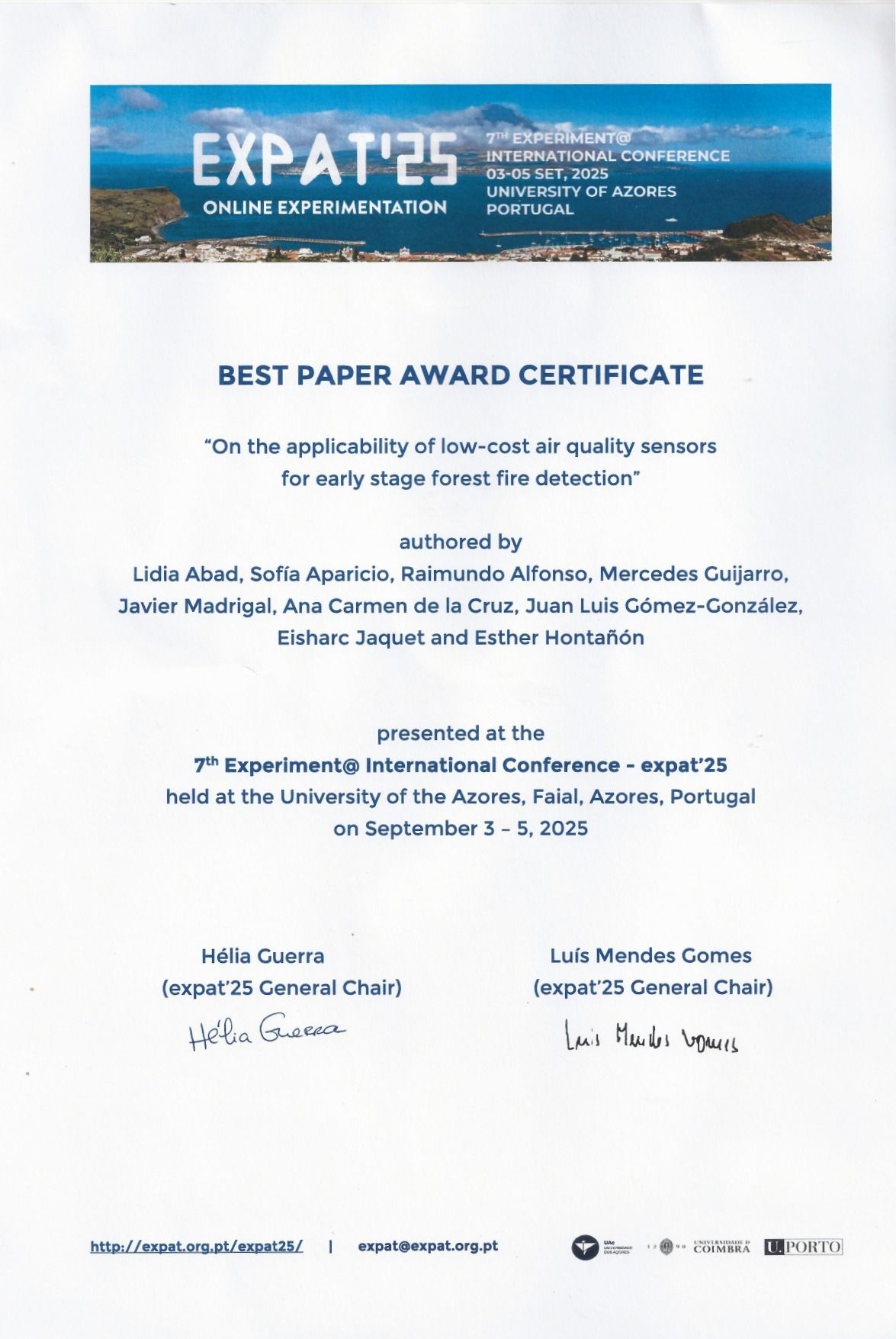 El equipo de investigadores del proyecto SenForFire Interreg Sudoe ha sido distinguido con el Premio al Mejor Artículo (Best Paper Award) en la Experiment@ International Conference 2025 (EXPA’25) por su estudio “On the applicability of low-cost air quality sensors for early stage forest fire detection”. El trabajo propone un sistema pionero de detección temprana de incendios forestales mediante sensores de calidad del aire de bajo coste, con el objetivo de reducir los tiempos de respuesta y mitigar el impacto de los incendios en los ecosistemas.