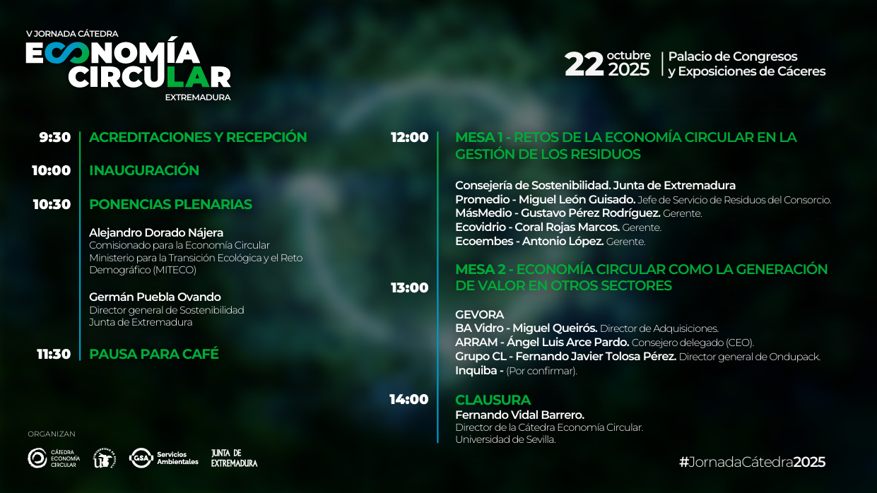 El encuentro se celebrará en formato presencial y contará con la participación del comisionado para la Economía Circular. Ministerio para la Transición Ecológica y el Reto Demográfico (MITECO), Alejandro Dorado Nájera, y del director general de Sostenibilidad de la Consejería de Agricultura, Ganadería y Desarrollo Sostenible de la Junta de Extremadura, Germán Puebla Ovando, quienes serán los encargados de ofrecer las ponencias plenarias sobre las últimas estrategias y normativas en economía circular a nivel nacional y autonómico.