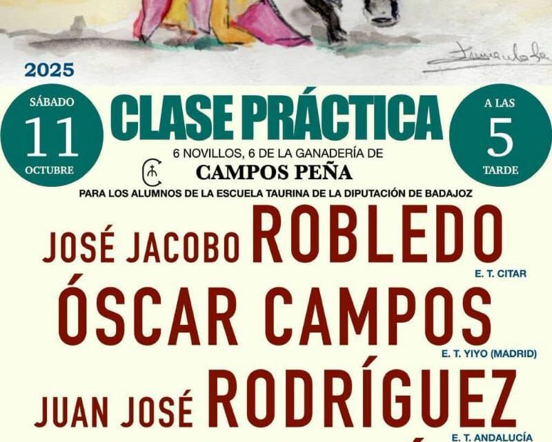 La Plaza de Toros de Fuente del Maestre acoge este sábado 11 de octubre, a partir de las 17:00 horas, una Clase Práctica de la Escuela de Tauromaquia de la Diputación de Badajoz, la cual se podrá presenciar con entrada gratuita y sin necesitar invitación.