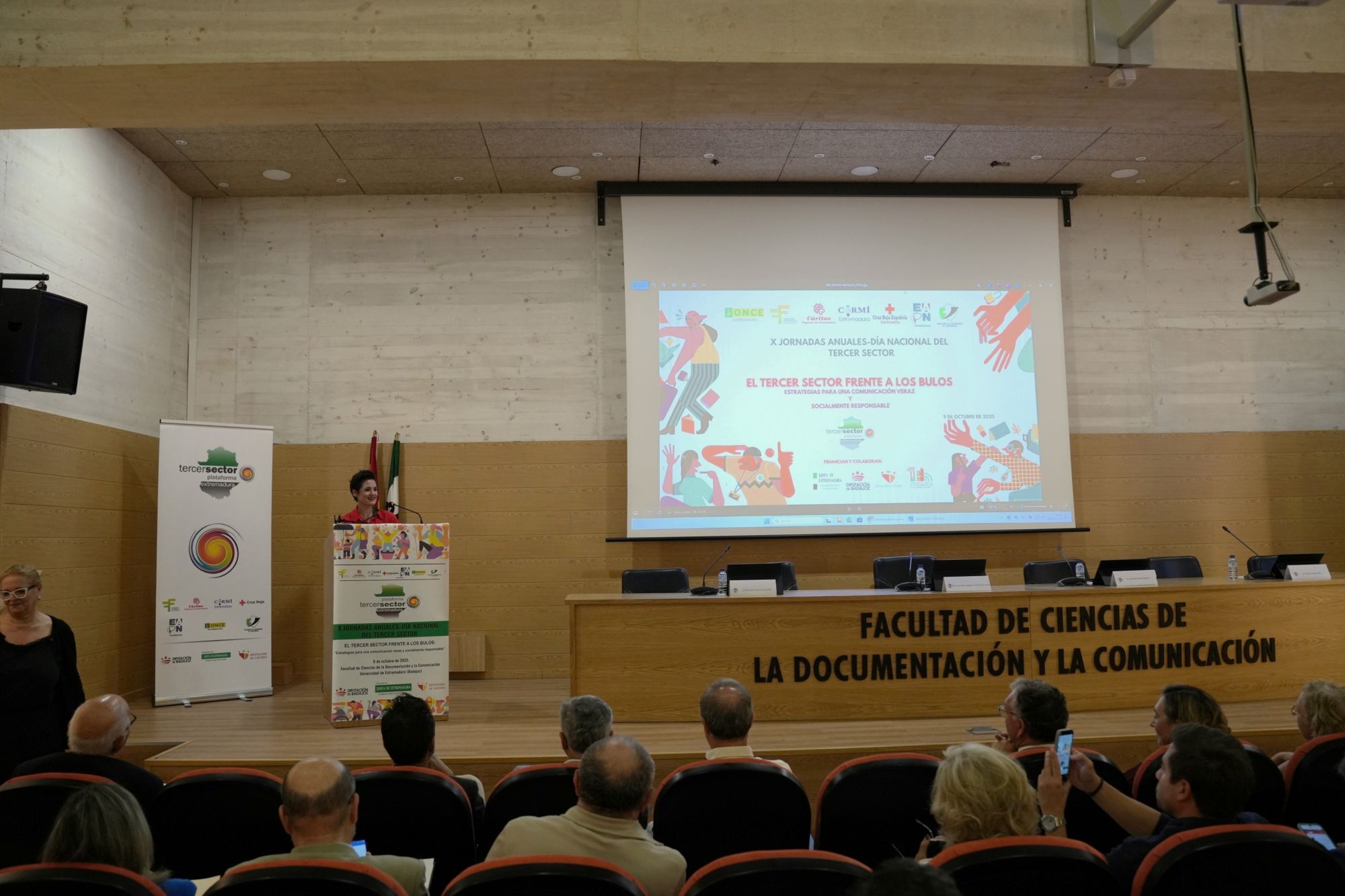 La presidenta de la Diputación de Badajoz, Raquel del Puerto, ha participado hoy en la inauguración de las X Jornadas Anuales de la Plataforma del Tercer Sector de Extremadura, celebradas en la Facultad de Ciencias de la Documentación y la Comunicación de la Universidad de Extremadura bajo el lema ‘El tercer sector frente a los bulos: Estrategias para una comunicación veraz y socialmente responsable’. Durante el acto de apertura institucional, la presidenta de la Diputación ha puesto en valor el papel esencial que desempeñan las entidades del Tercer Sector en la sociedad actual.