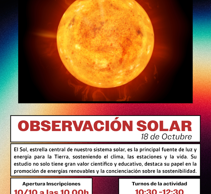 Durante la jornada, los participantes podrán observar la superficie solar de forma segura mediante telescopios equipados con filtros específicos y disfrutar de una sesión interpretativa guiada por personal especializado. La actividad permitirá contemplar manchas y protuberancias solares, comprender la dinámica del Sol y su influencia sobre el clima, la energía y la vida en nuestro planeta.