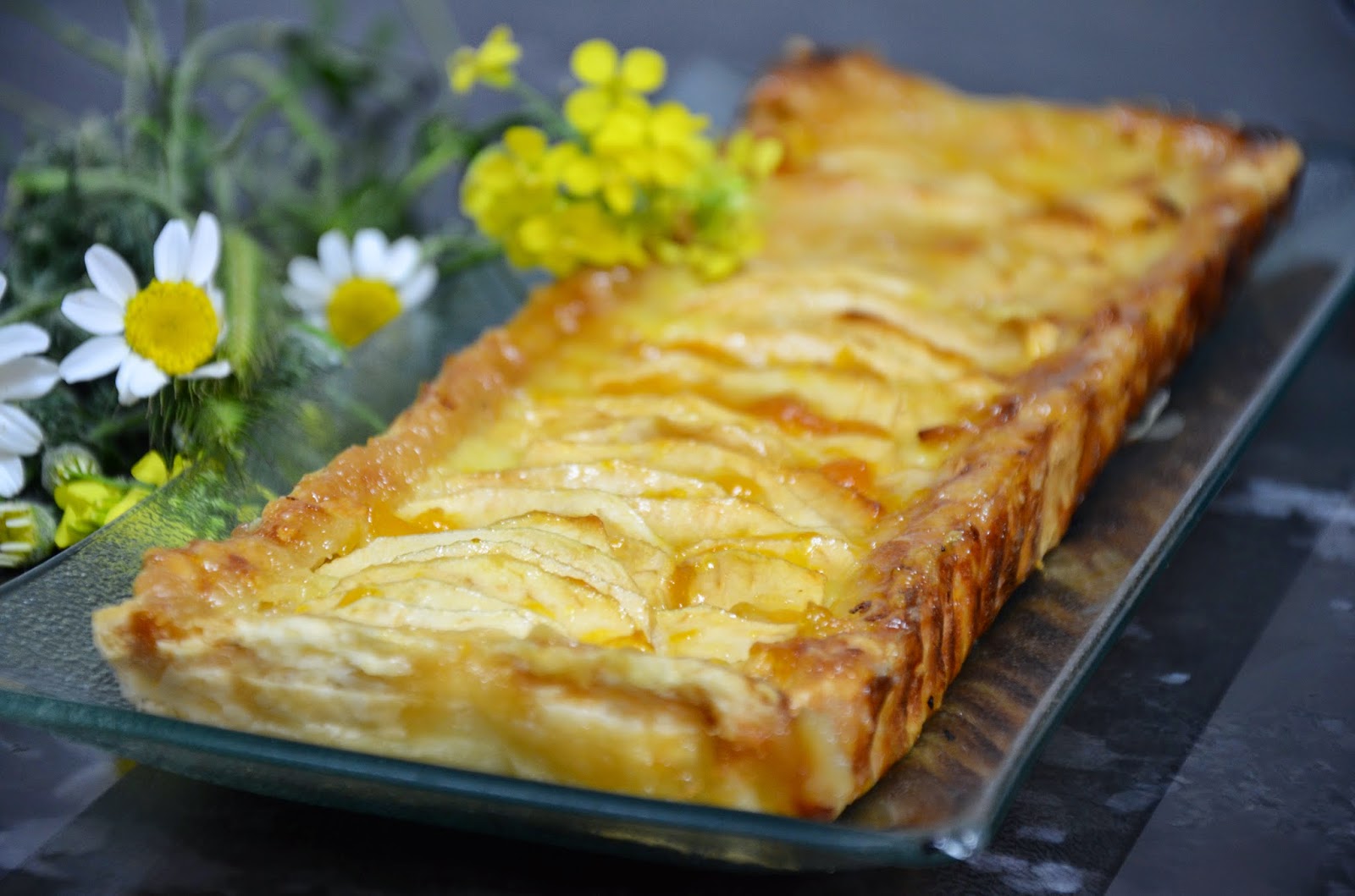 Pincelamos el hojaldre de la tarta con huevo batido, espolvoreamos un poco de azúcar encima y la horneamos unos 15 minutos hasta que la manzana esté tostada y el borde dorado.