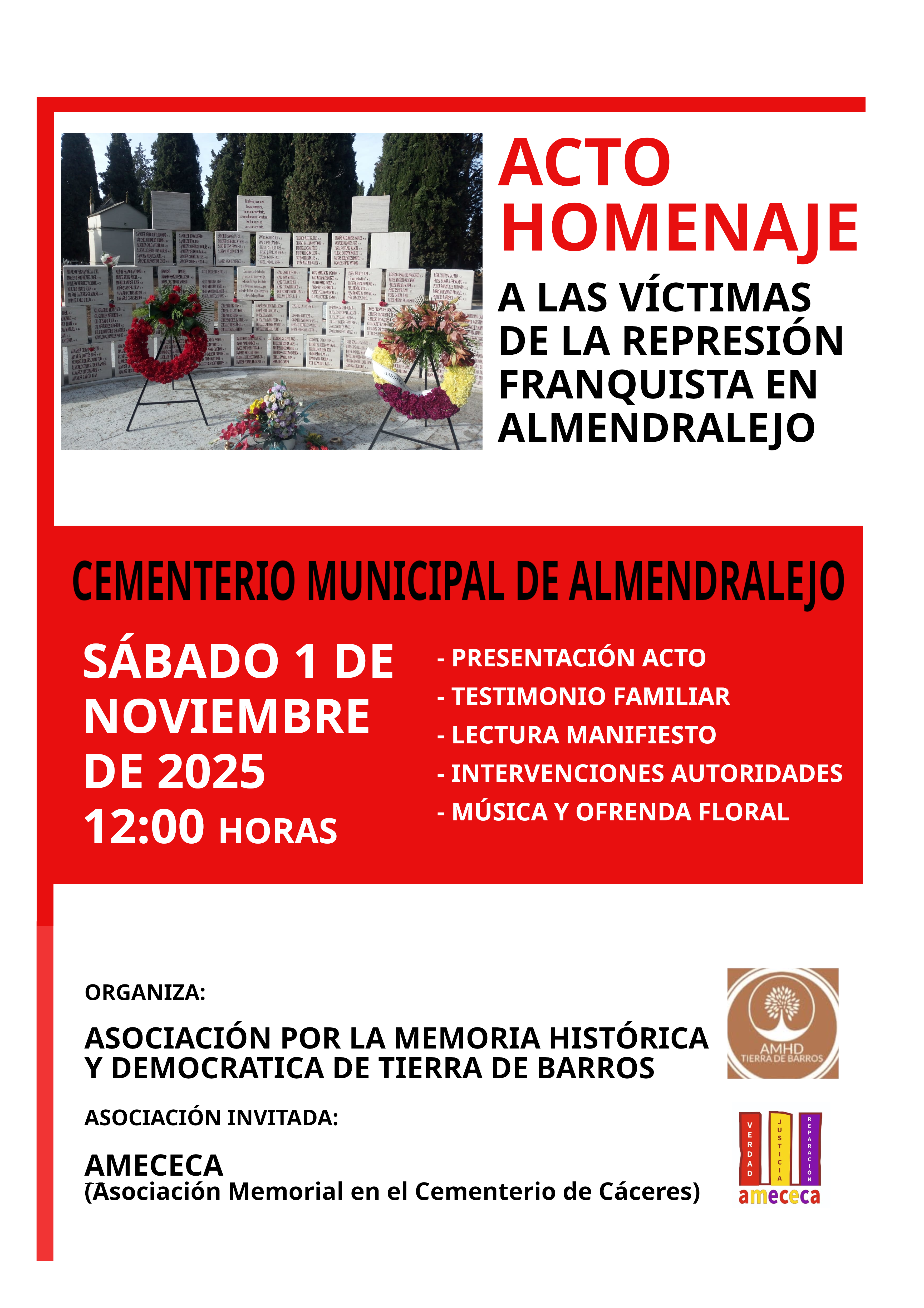 Este acto de reconocimiento y homenaje público a las víctimas de la represión franquista anual lo celebrarán a las 12:00 horas del día 1 de noviembre en la parte central del camposanto donde se ha construido el Memorial y más este año dada la derogación de la Ley de memoria democrática de Extremadura, por la denominada “ Ley de Concordia”.