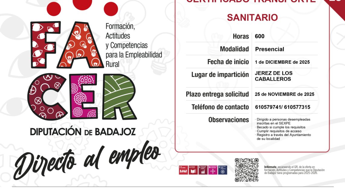 La Diputación de Badajoz, a través del Proyecto FACER (Formación, Actitudes y Competencias para la Empleabilidad Rural), ha puesto en marcha el proceso de recepción de solicitudes para una nueva acción formativa. El itinerario formativo bajo el nombre de “Certificado en Transporte Sanitario”, ofrece formación de manera completamente gratuita en el sector sanitario, buscando mejorar las oportunidades de empleo en el entorno rural.