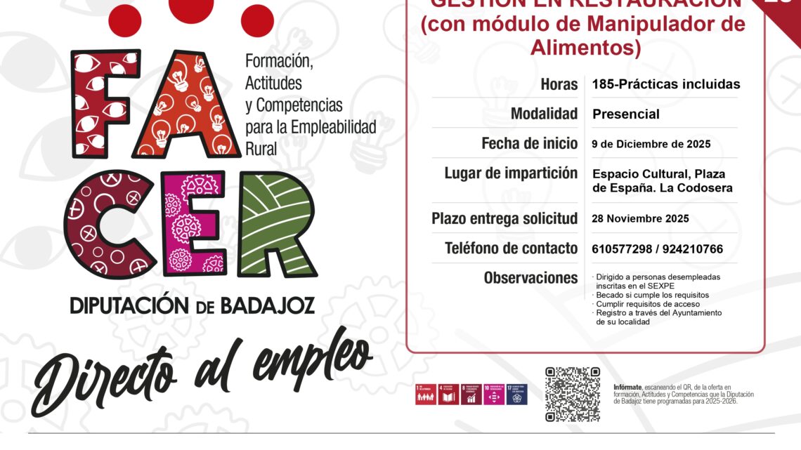 El Proyecto FACER, desarrollado por la Diputación de Badajoz a través del Área de Formación y Capacitación para el Empleo, ha iniciado el plazo de una nueva acción formativa bajo la denominación “Gestión de restauración”, que se desarrollará en la localidad pacense de La Codosera y cuyo inicio está previsto para el 9 de diciembre de este año.