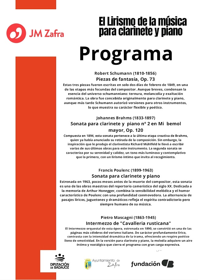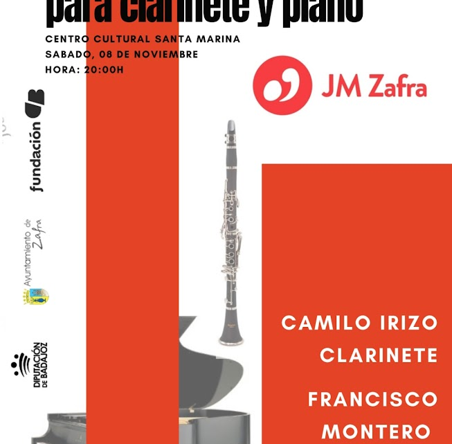 Juventudes Musicales de Zafra vuelve a su cita con la mejor música en directo el sábado 8 de noviembre a las 20 horas en el Centro Cultural Santa Marina de la Fundación CB. En esta ocasión, se podrá disfrutar del clarinete de Camilo Irizo y el piano de Francisco Montero en un concierto titulado “El Lirismo de la Música para Clarinete y Piano”.