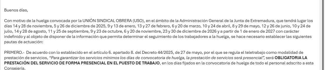 La Unión Sindical Obrera de Extremadura (USO) denuncia públicamente la instrucción remitida hoy por la Administración General de la Junta de Extremadura a sus centros directivos, en la que se ordena la obligatoriedad de la prestación presencial del servicio para todo el personal teletrabajador durante los días de huelga convocados por USO.