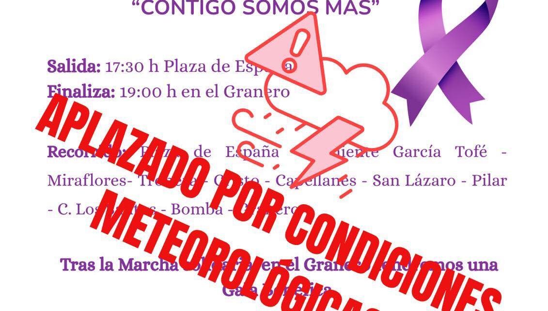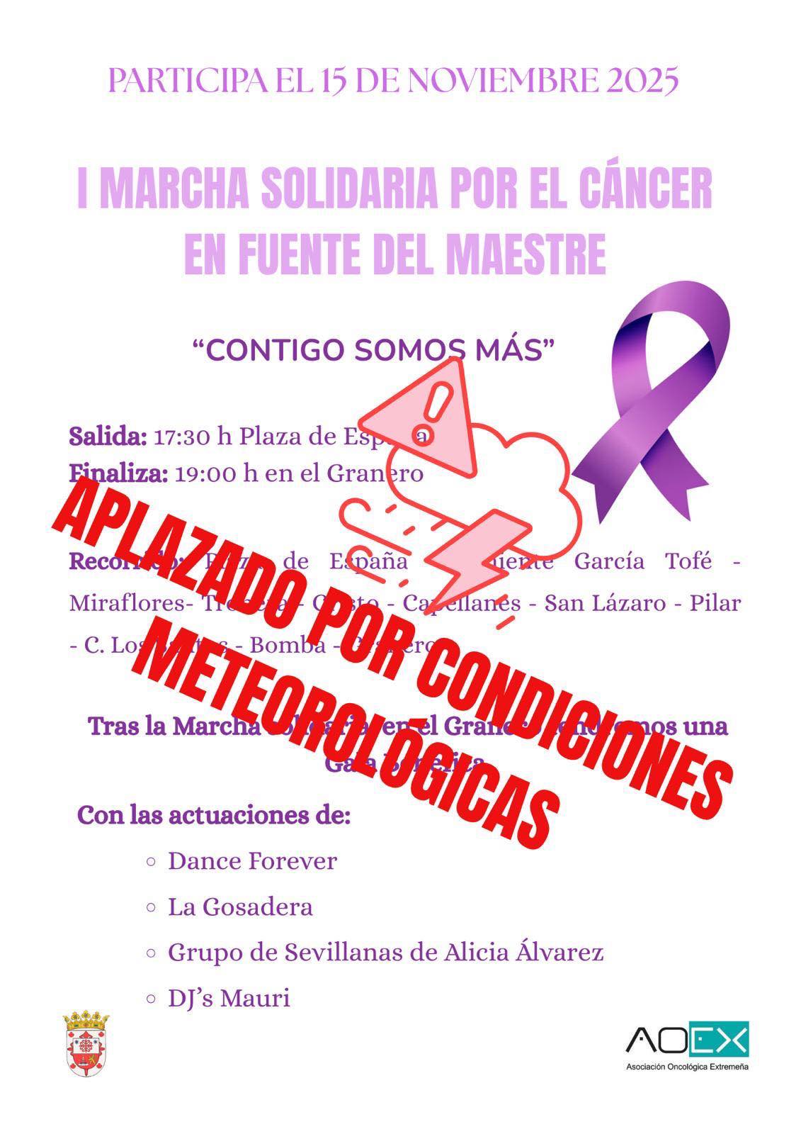 Debido a las previsiones meteorológicas adversas , se aplaza la I Marcha Solidaria por el Cáncer en Fuente del Maestre (Badajoz), prevista para este sábado 15 de Noviembre, y organizada por la Asociación Oncológica Extremeña en colaboración con el ayuntamiento de la localidad.