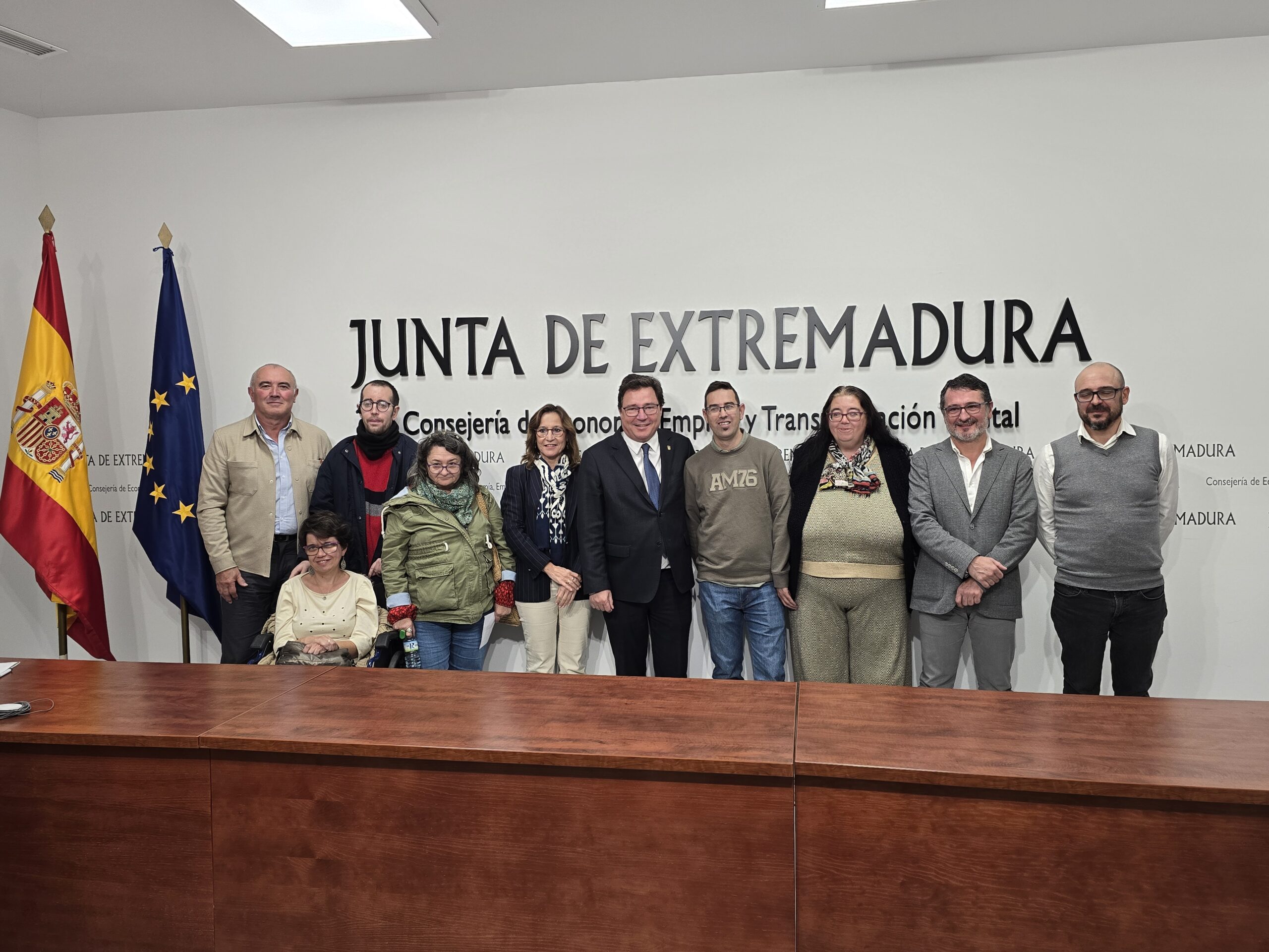 El Equipo de Líderes de Plena inclusión Extremadura ha sido recibido este jueves por el consejero de Economía, Empleo y Transformación Digital, Guillermo Santamaría, con el objetivo de trasladar sus principales reivindicaciones en materia de empleo, reducción de la brecha digital y mejora de la accesibilidad, aspectos clave reivindicados desde el programa de Ciudadanía Activa, para garantizar los derechos de las personas con discapacidad intelectual.