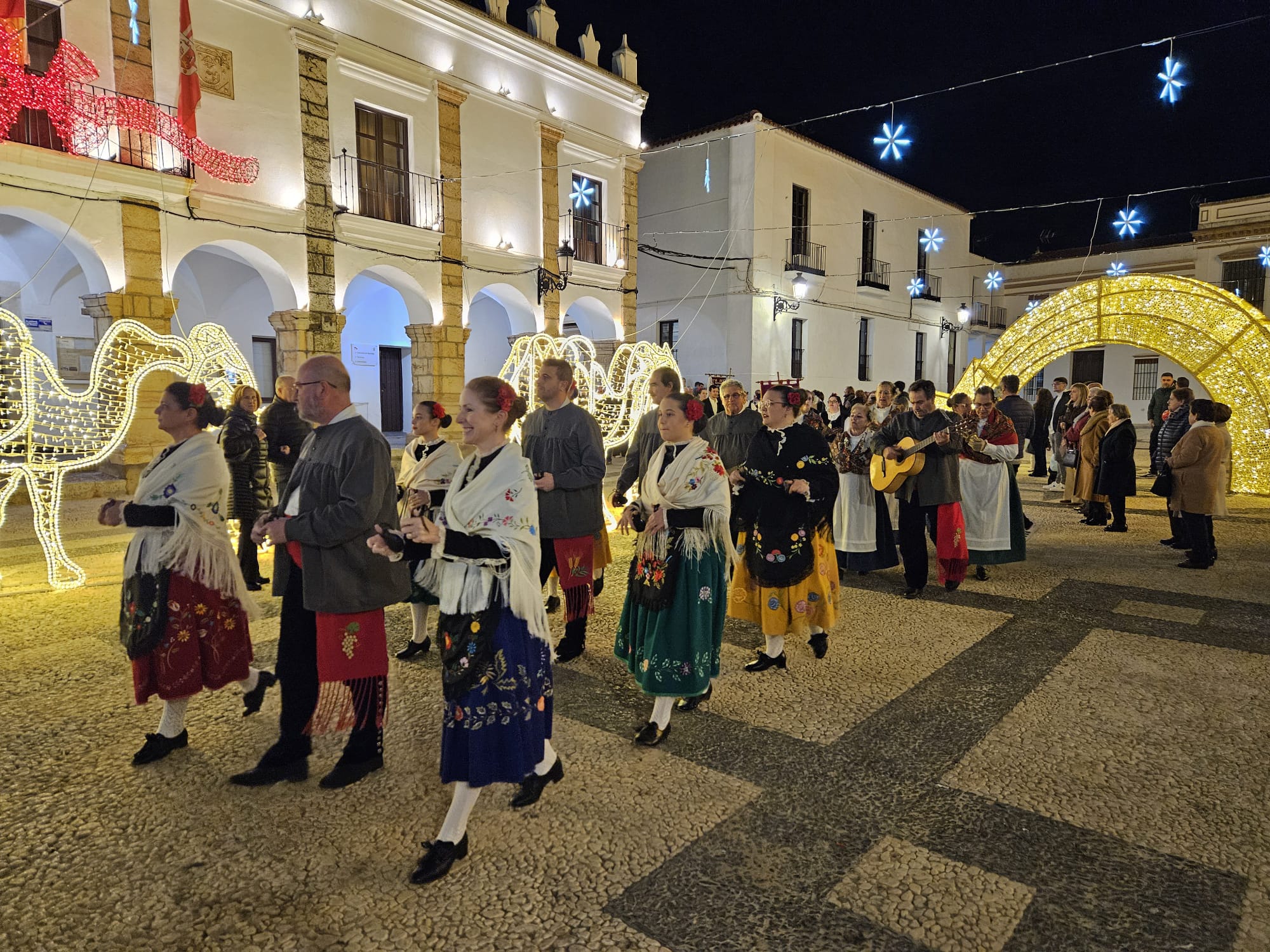 El vistoso pasacalles folklórico posterior trascurrió por el centro de Fuente del Maestre, pasando por el Mercadillo Navideño ubicado en La Corredera. Un acto que llenó las calles y plazas de cantos populares y mucha alegría.