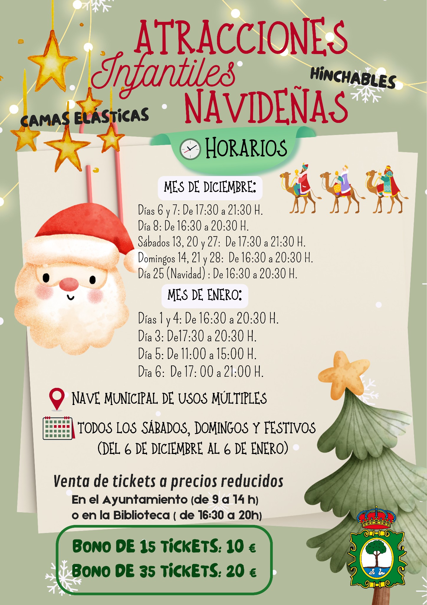 El Ayuntamiento de Ribera del Fresno ha anunciado que, un año más, los niños y niñas del municipio podrán disfrutar de distintas atracciones infantiles durante el periodo navideño. La actividad se desarrollará todos los sábados, domingos y días festivos desde el 6 de diciembre hasta el 6 de enero en la Nave Municipal de Usos Múltiples, tal como recoge la cartelería difundida por el consistorio.